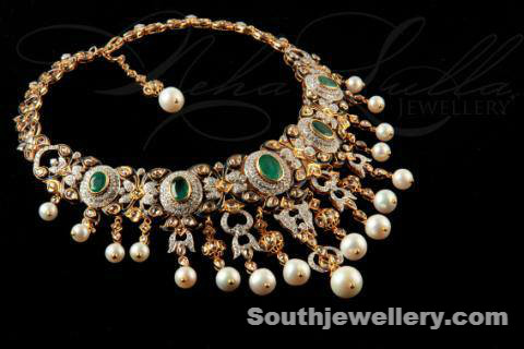 Intricately designed neck piece created with diamonds, emeralds, polkis, hanging south sea pearls, which is further enamelled to give it, its ethnic look. Picked from Neha Lulla’s Jewellery collection.