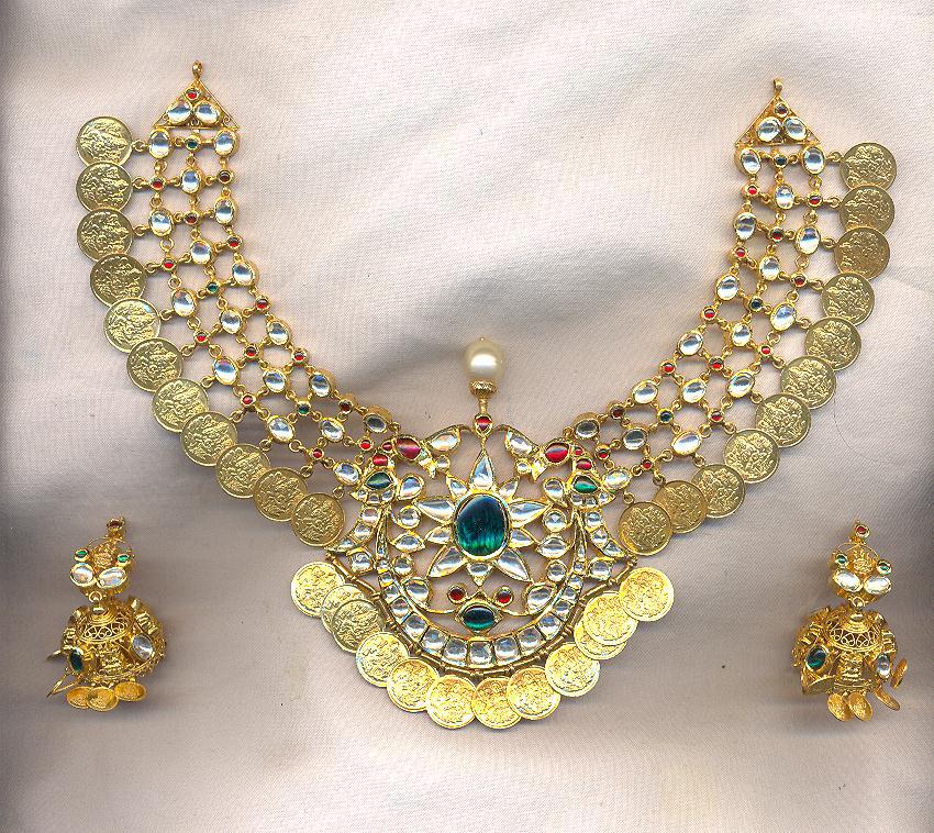 Traditional necklace studded with kundans, emeralds, rubies and a string of kasu chain, paired up with matching kasu earrings by Maheswari Jewellers.