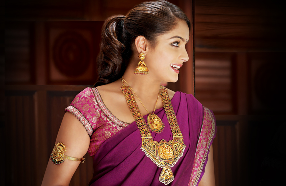 Model displaying temple jewellery, short chain with pendant, heavy gold long chain, vanki and heavy jhumkas.