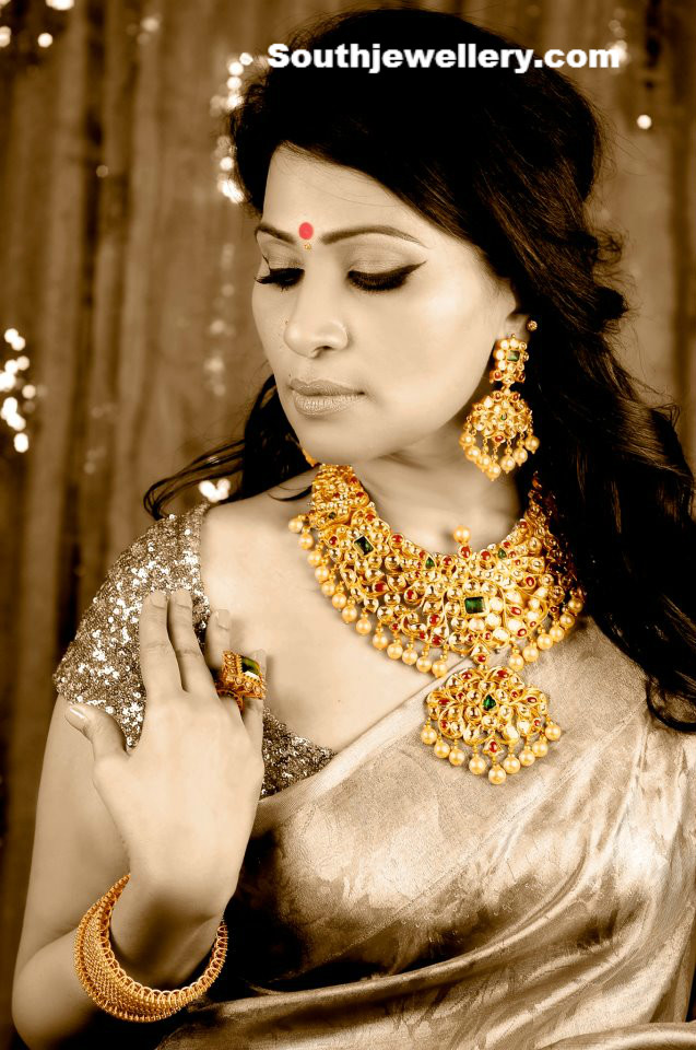 Celebrity JewelleryJewellery Designskundan NecklaceMBS Jewellery Nekkanti Shreedevi in MBS Jewellery Jul 18, 2013 FacebookTwitterPinterestWhatsApp Hyderabad socialite Nekkanti Shreedevi Chowdary in MBS gold jewellery, heavy bridal necklace studded with kundans, rubies and emeralds and matching earrings, and gold bangles set.