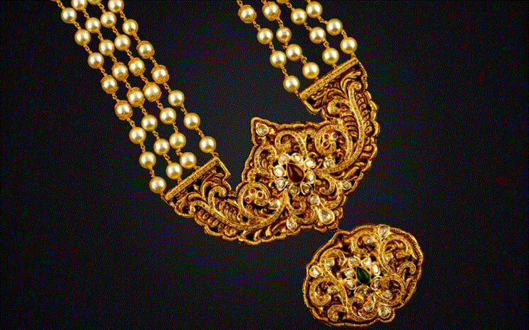 Pearls long chain with four strings of pearls with an antique pendant studded with uncut diamonds and precious stones by Aabharanam Jewellers.