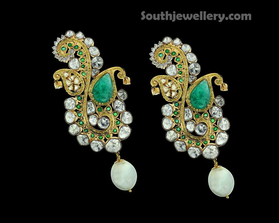 18k gold diamond and emerald necklace with pendant paired with matching jhumkas, maang tikka and bangle by Krishna Jewellers, Pearls & Gems.