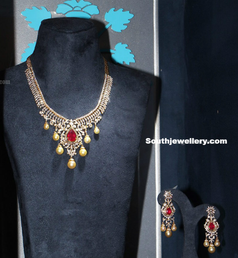 Diamond earringsDiamond NecklaceJewellery Designs Diamond Necklace by CMR Aug 3, 2013 FacebookTwitterPinterestWhatsApp Diamond necklace with large central ruby and hanging south sea pearls, paired up with matching diamond earrings.