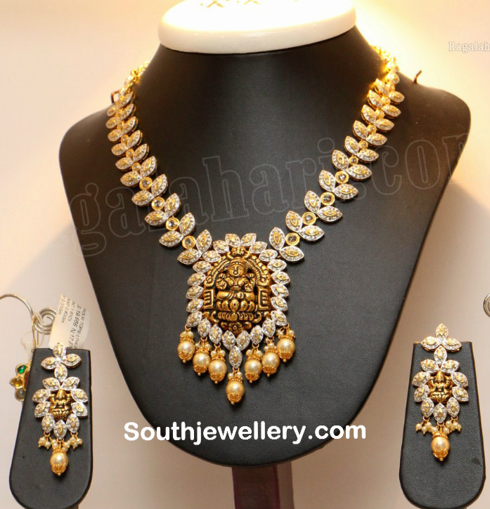 Hyderabad ShoppingJewellery DesignsNakshi JewelleryTemple JewelleryUncut Diamond Earrings Diamond Necklace with Nakshi Pendant Aug 20, 2013 FacebookTwitterPinterestWhatsApp Stunning temple necklace in leaf design studded with diamonds and attached antique Lakshmi pendant with hanging south sea pearls, complemented by matching Lakshmi earrings. Designed by Radha Ghantasala of RR Jewellers showroom, Hyderabad.