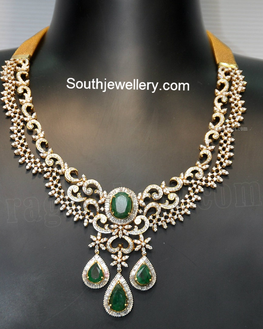 22k gold satlada haar adorned with south sea pearls, emerald beads and uncut diamonds; and plain gold vaddanam with uncut diamond pendant.
