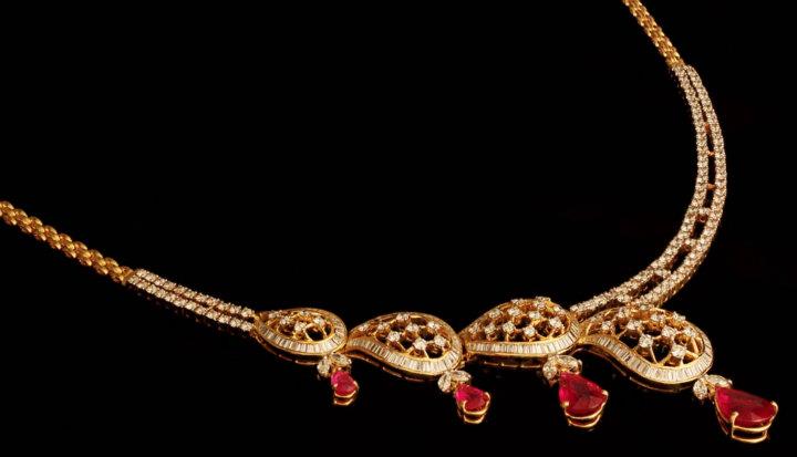 22 carat gold pacchi necklace with Goddess Lakshmi pendant sstudded with uncut polki diamonds, rubies, emeralds and south sea pearl drops.