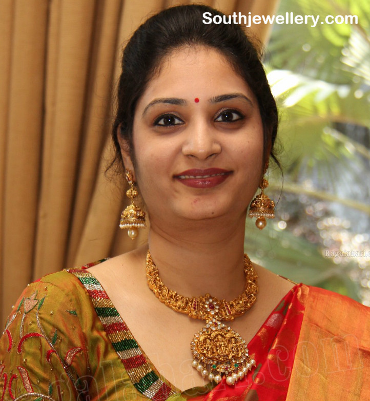 18 carat gold gorgeous floral design diamond haram with two step peacock pendant studded with shimmering diamonds, rubies and emerald.
