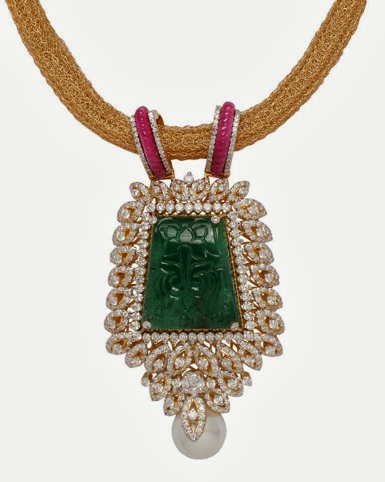 22k gold antique peacock kundan bottu haram with Lakshmi pendant studded with rubies, emeralds and uncut diamonds by Pinaki jewellers.