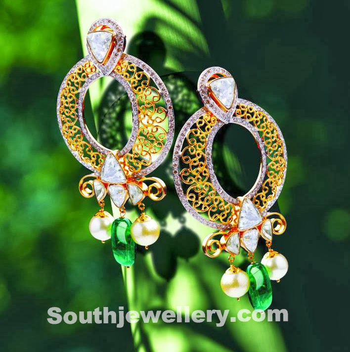 18k gold 4 in 1 convertible diamond chandbali jhumkis made of diamonds, rubies and pearls by Sri Mahalaxmi gems & jewellers.