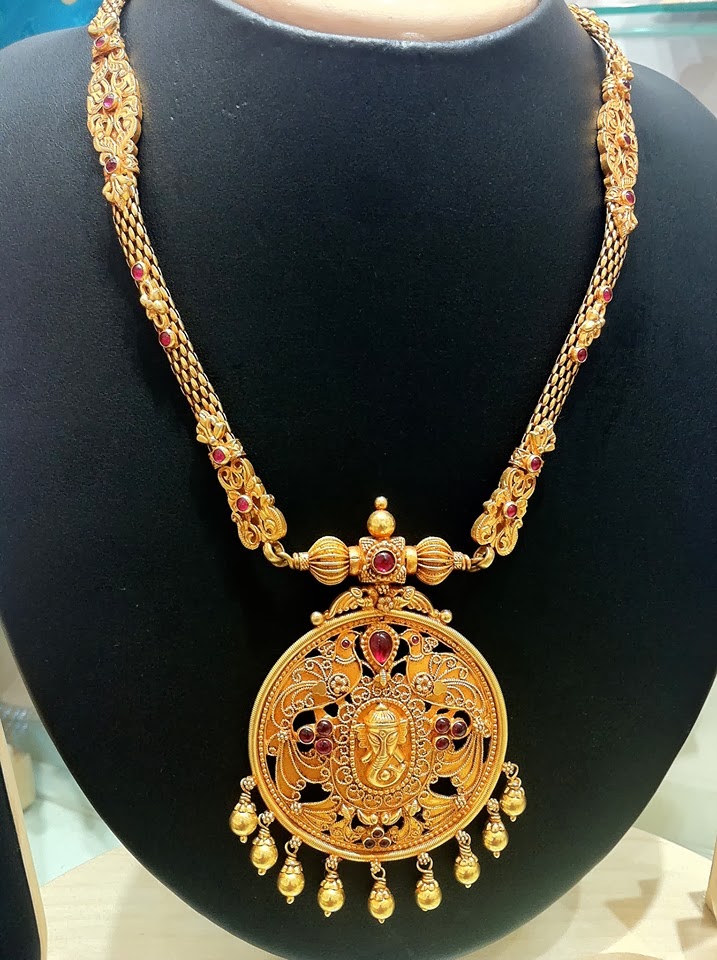 Gold NecklaceGold PendantJewellery Designs Elegant Necklace with Ganesh Pendant Nov 8, 2013 FacebookTwitterPinterestWhatsApp Gold necklace with Ganesh pendant studded with rubies.