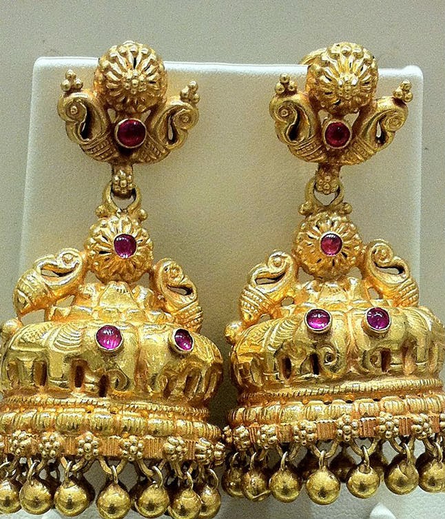 Gold EarringsJewellery DesignsJhumkas Traditional Gold Jhumkas Nov 6, 2013 FacebookTwitterPinterestWhatsApp Traditional gold jhumkas with elephant design studded with rubies.