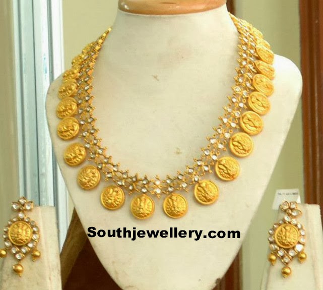 Jewellery DesignsKasu malaKasu NecklaceTemple JewelleryUncut Diamond Necklace Uncut Lakshmi Kasumala Dec 11, 2013 FacebookTwitterPinterestWhatsApp Unique Lakshmi kasu necklace studded with uncut diamonds, paired up with matching uncut Lakshmi earrings.