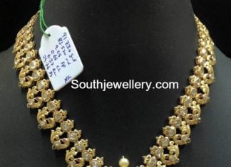 22 carat gold antique chandraharam featuring flat diamond side pendants and back chain adorned with south sea pearls and emerald beads designed by Nikitha Linga.