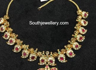 22 carat gold simple mango necklace with peacock pendant studded with kundans.