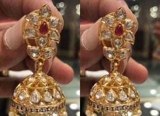 22 carat gold jhumkas adorned with moissanites, rubies and south sea pearls by Premraj Shantilal Jewellers. Weight:32 grams